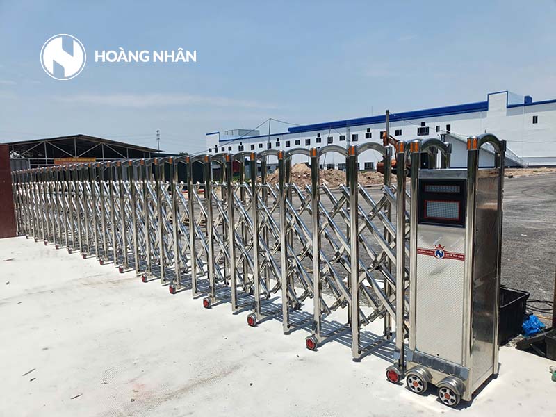 Cổng xếp inox 304 cao 1.6m, dài 23m, sử dụng đầu máy cảm biến không ray hiện đại, vận hành êm ái, độ bền cao.