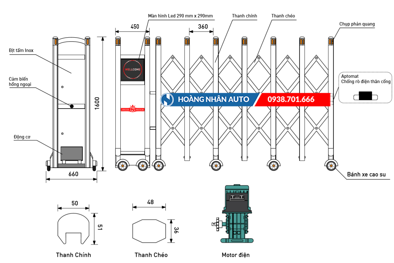 Vật liệu inox 201 nhập khẩu, chiều cao 1600mm, chiều dài kéo dãn 13000mm. Sử dụng motor điện cổng xếp cảm ứng từ không cần ray.